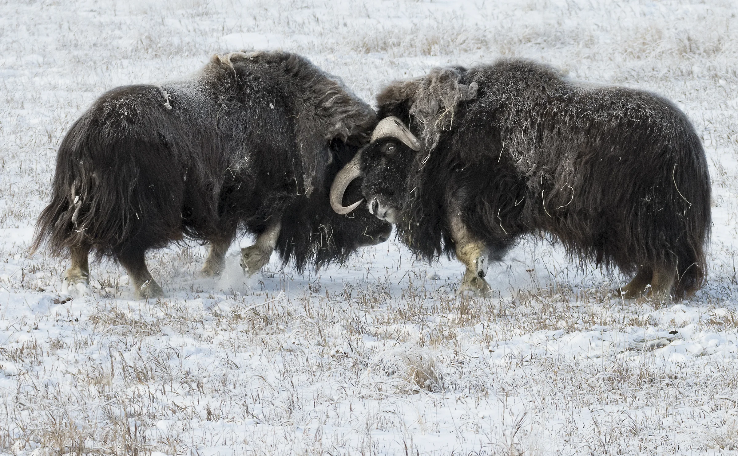 Take for example these musk ox in this photo. Musk Ox are more mobile in colder temperatures. So you want to go photograph them in colder versus warmer weather. Studying them will also help you understand that the bachelors hang out together, and even in the winter have some testosterone raging… that testosterone causes them to display mild aggressive displays…